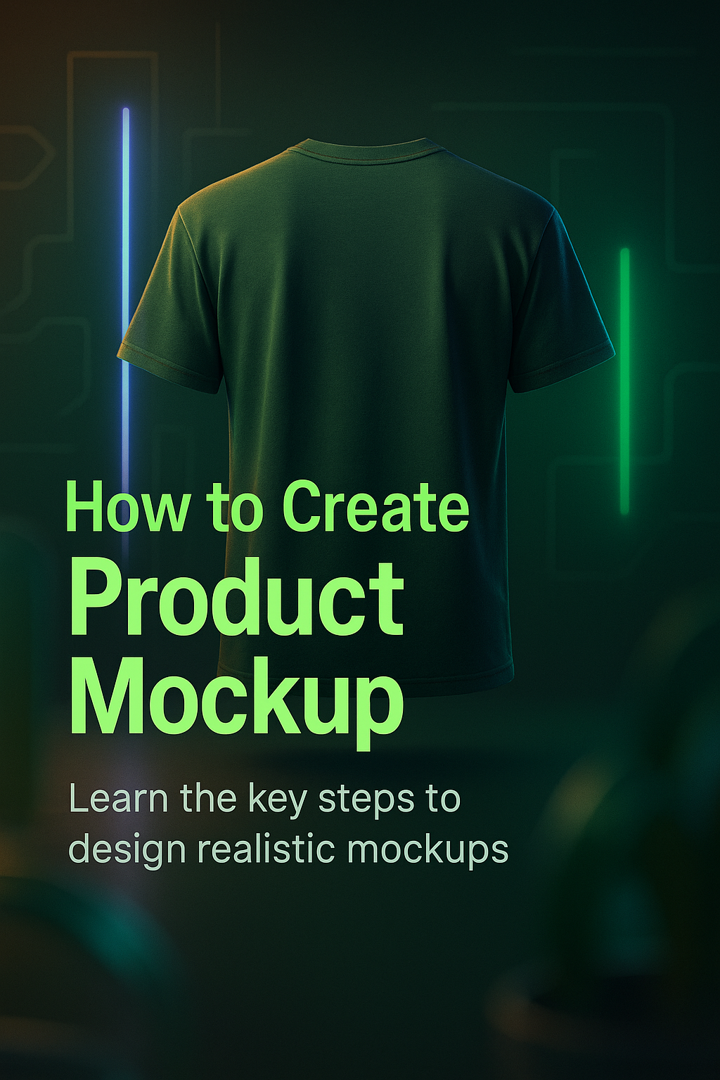 /Collection: /by davooda/Type: PNG/Informative graphic illustrating steps to create product mockups, featuring a sleek t-shirt design and vibrant neon accents, ideal for design tutorials and marketing.
