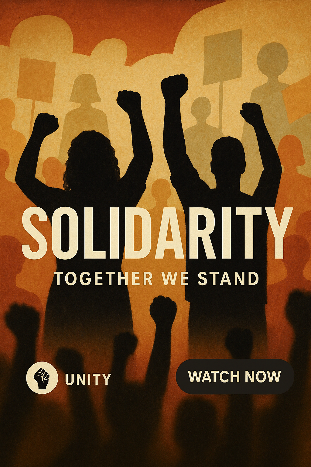 Striking activist-themed poster showcasing silhouettes of people raising fists in solidarity, designed for social movements and awareness campaigns. Ideal for promoting unity and engagement.