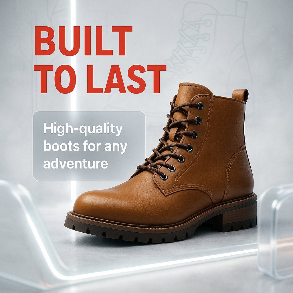 A visually appealing advertisement showcasing a high-quality boot, designed for durability and adventure. The modern aesthetic is perfect for footwear marketing.