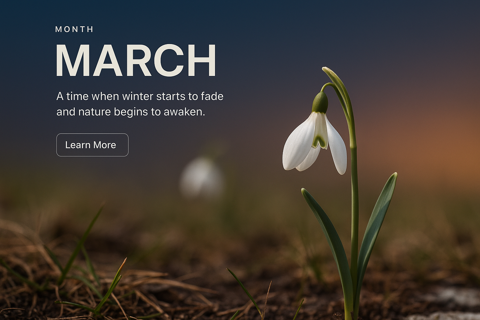A visually appealing web design for March featuring a snowdrop flower. The design includes a clear title, descriptive text, and a call-to-action button, all in a cohesive layout.