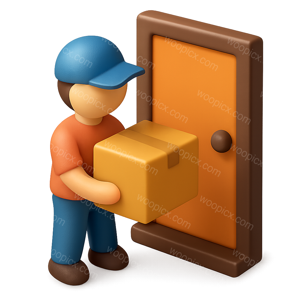 A stylized 3D icon depicting a person in a blue cap holding a yellow box while standing at a door. The design is isometric with a volumetric feel, emphasizing simplicity and clarity.
