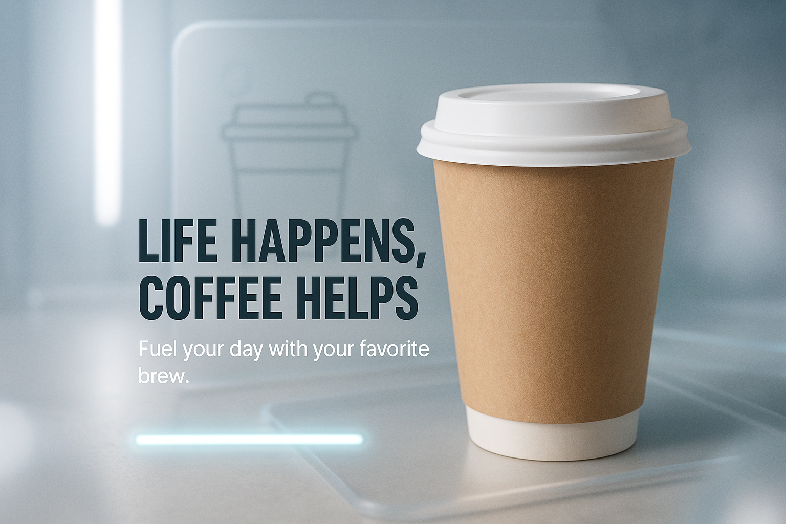 Stylish promotional image showcasing a takeaway coffee cup, emphasizing the comforting role of coffee in daily life. Ideal for cafes or beverage marketing.
