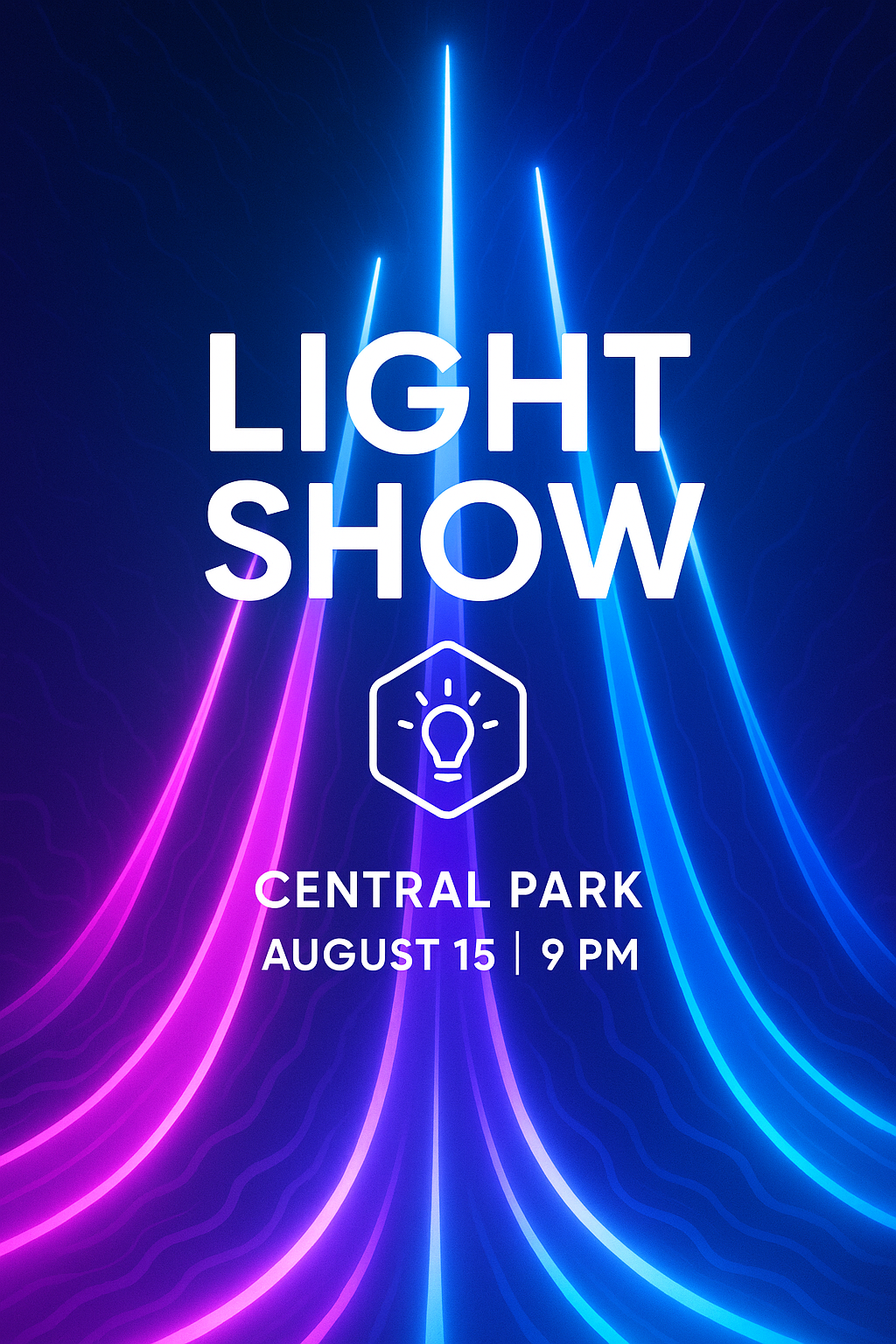 Dynamic promotional graphic featuring a light show announcement with neon effects, suitable for events and entertainment marketing.