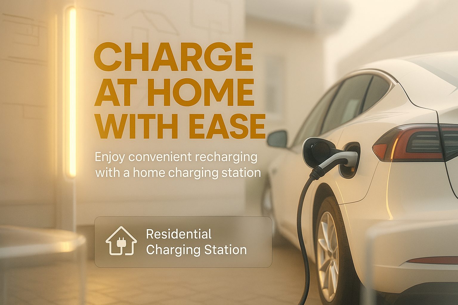 Promotional image showcasing a home electric vehicle charging station, featuring a modern design with a vehicle plugged in, ideal for marketing to homeowners interested in electric vehicle solutions.