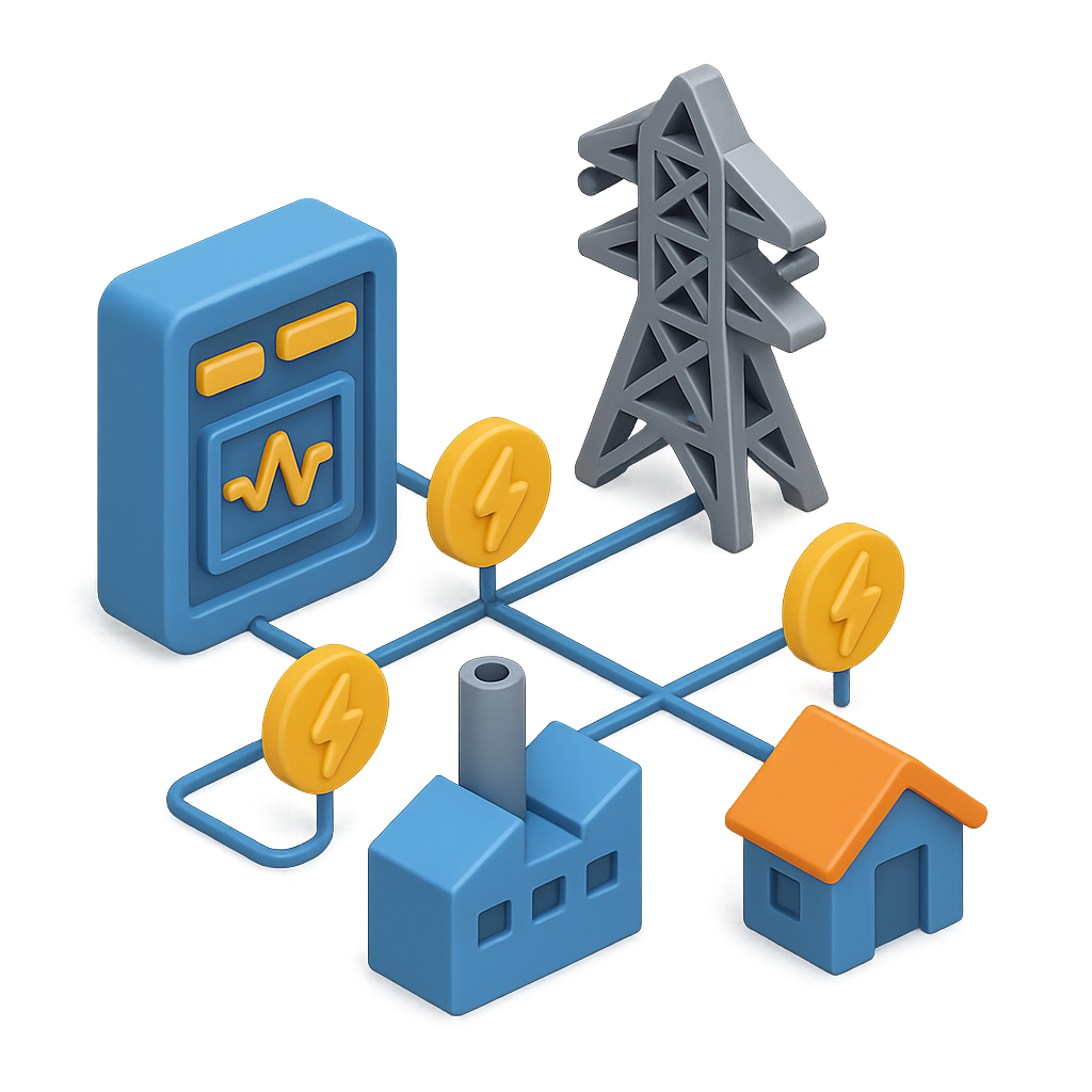 This image features a colorful 3D isometric smart grid icon, showcasing a power distribution system with a power line, factory, and house, all interconnected.