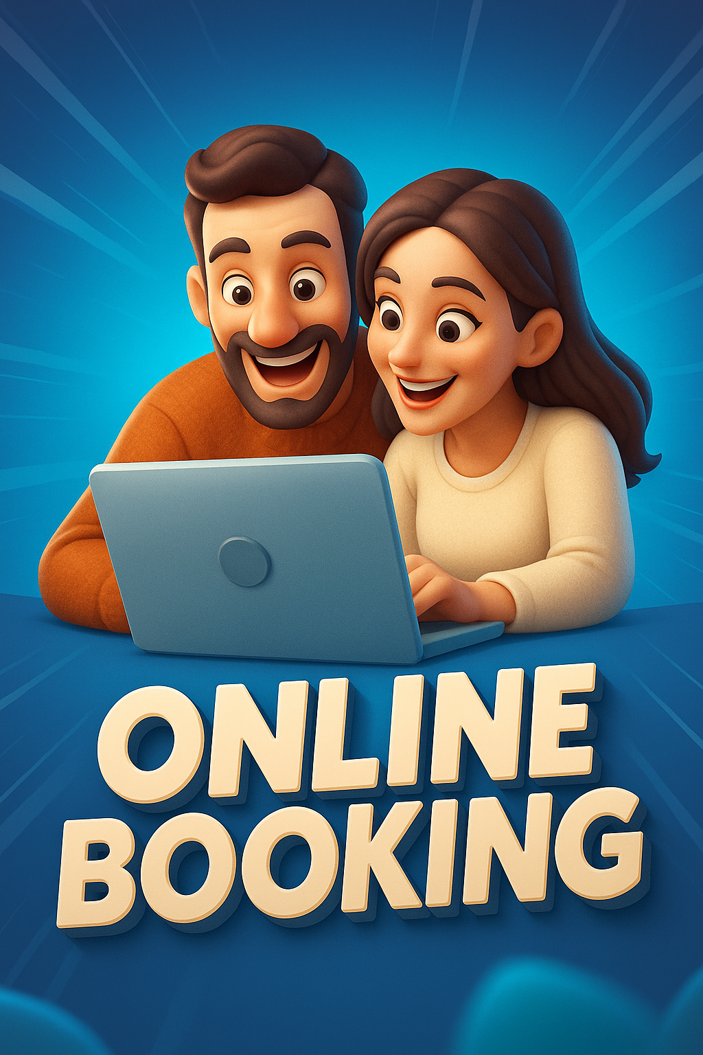 /Collection: /by davooda/Type: PNG/A cheerful couple engages in online shopping on a laptop, showcasing a dynamic and vibrant scene. The background features smooth gradients and rays of light, enhancing the joyful atmosphere.