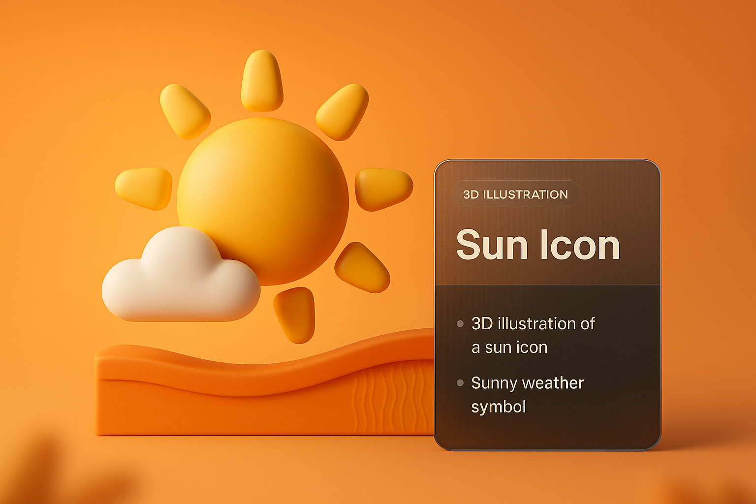 A colorful 3D illustration of a sun icon accompanied by a cloud, set against a warm orange background. Includes a stylish text block detailing the concept.