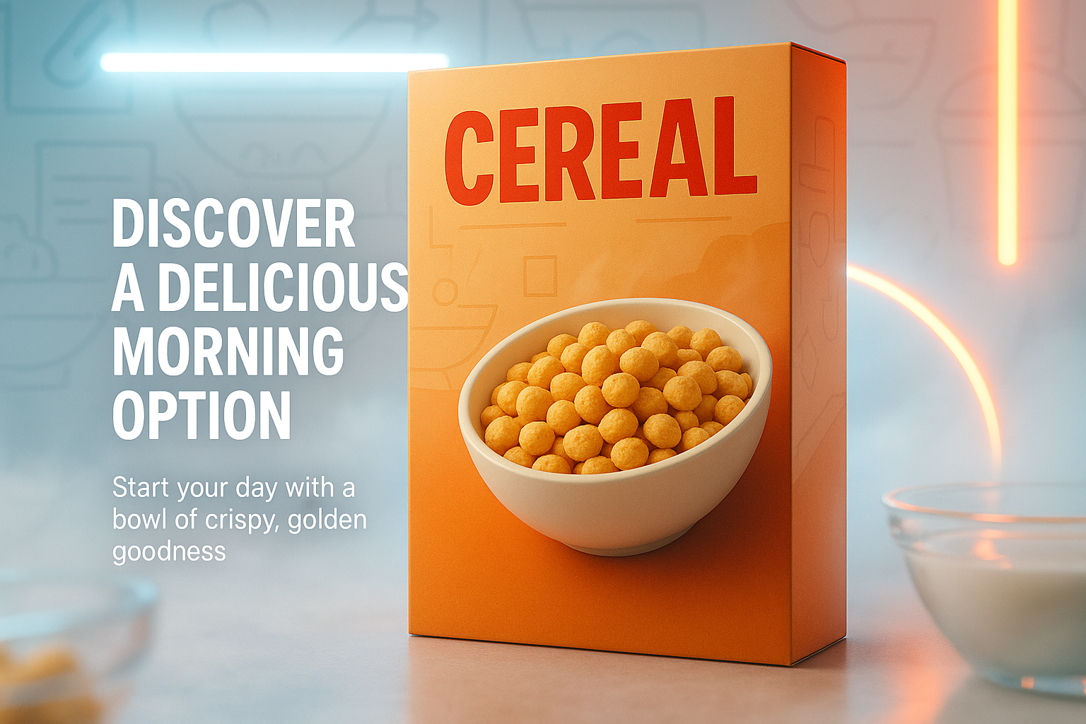 Vibrant cereal packaging mockup showcasing a bowl of cereal with engaging text, perfect for advertising breakfast products in digital and print media.