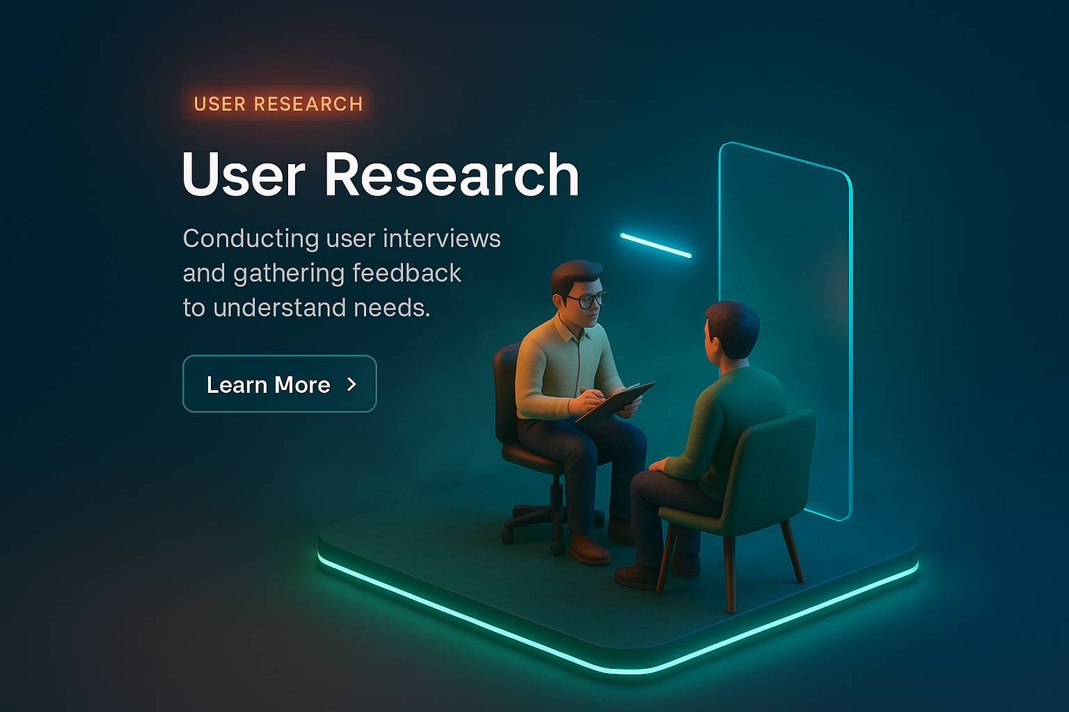A detailed 3D scene depicting a user research scenario with neon accents. The image features two characters engaging in conversation, illuminated by soft neon lights in a dark, gradient background.
