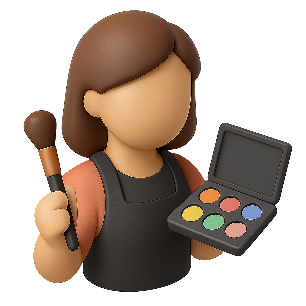 /Collection: /by davooda/Type: PNG/A stylized 3D icon depicting a makeup designer holding a brush and a palette with vibrant colors. The design features a smooth, volumetric look with a three-quarter view and a transparent background.