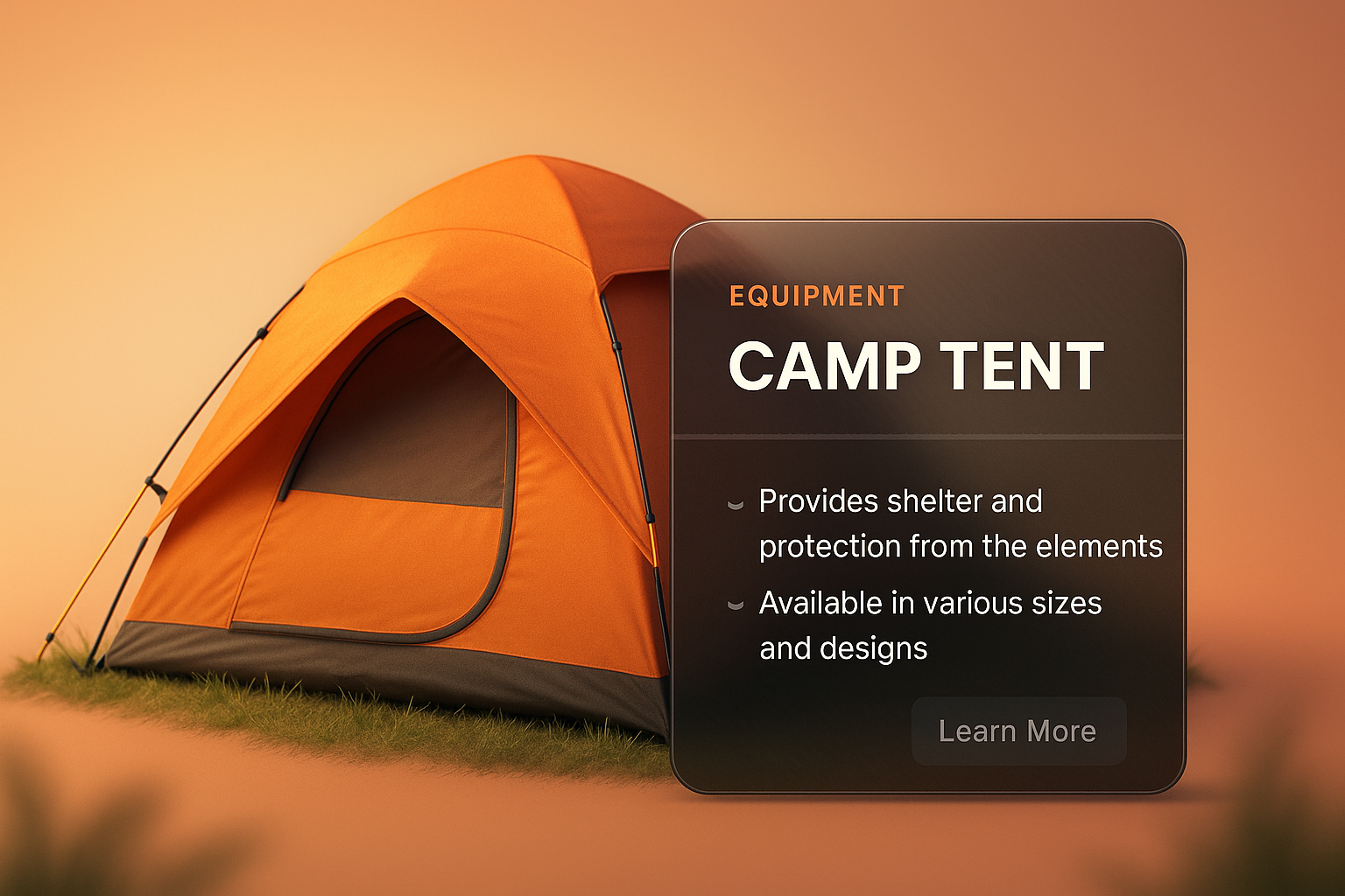 /Collection: /by davooda/Type: PNG/This image features a realistic 3D illustration of a camp tent, highlighted with a dark overlay containing key information. The background transitions smoothly, enhancing the tent's visibility.