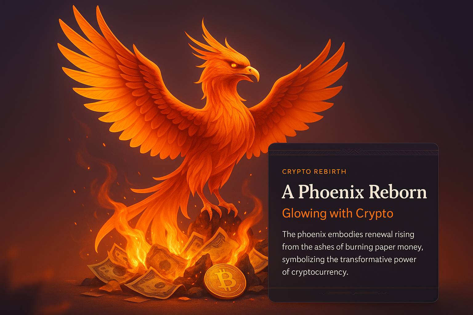 A vibrant phoenix emerges from burning paper money, radiating with a crypto glow. The illustration symbolizes renewal and the power of cryptocurrency.
