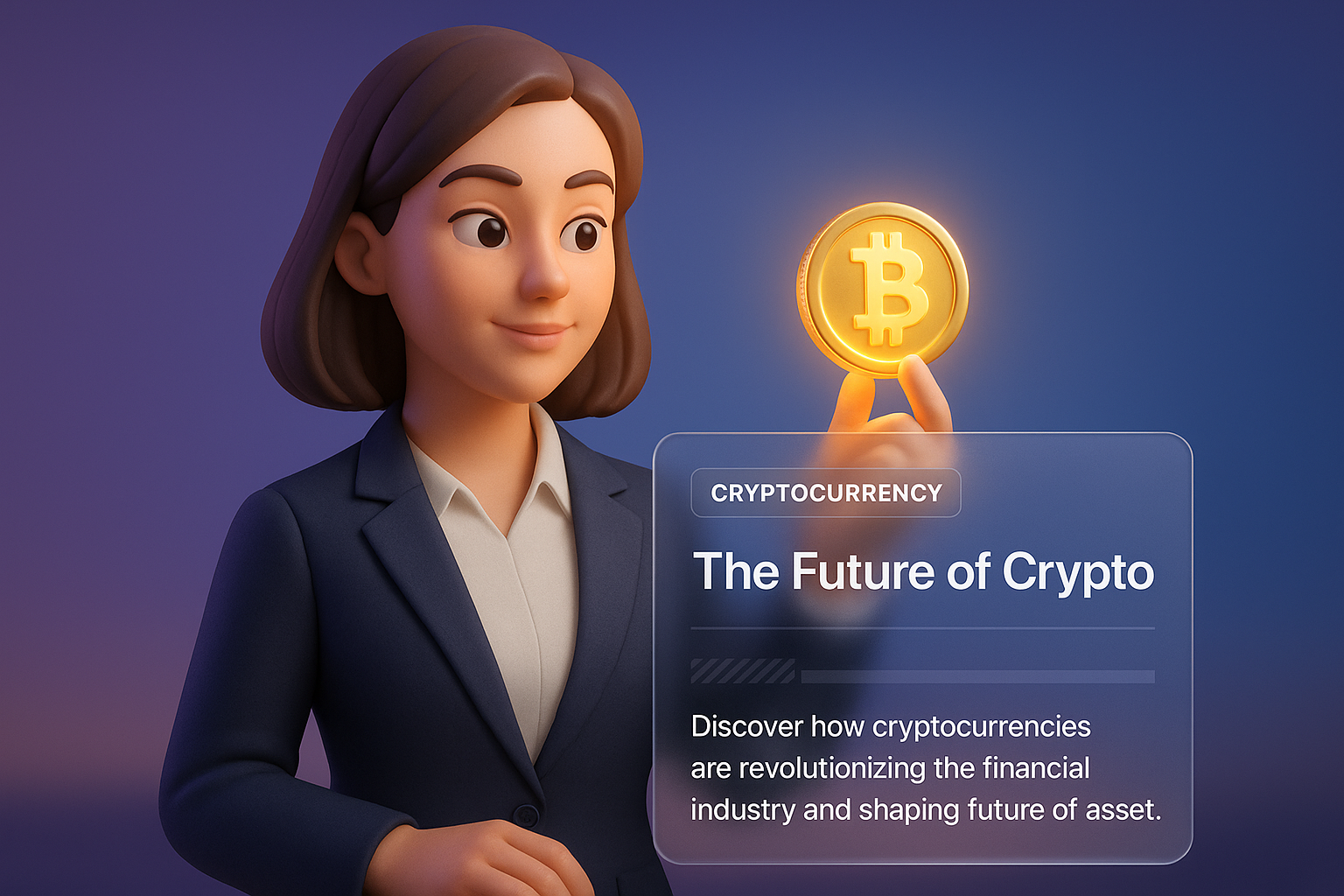 /Collection: /by davooda/Type: PNG/A 3D illustration of a businesswoman holding a glowing cryptocurrency coin, symbolizing the future of digital finance. The background features a smooth gradient, enhancing the focus on the character and coin.