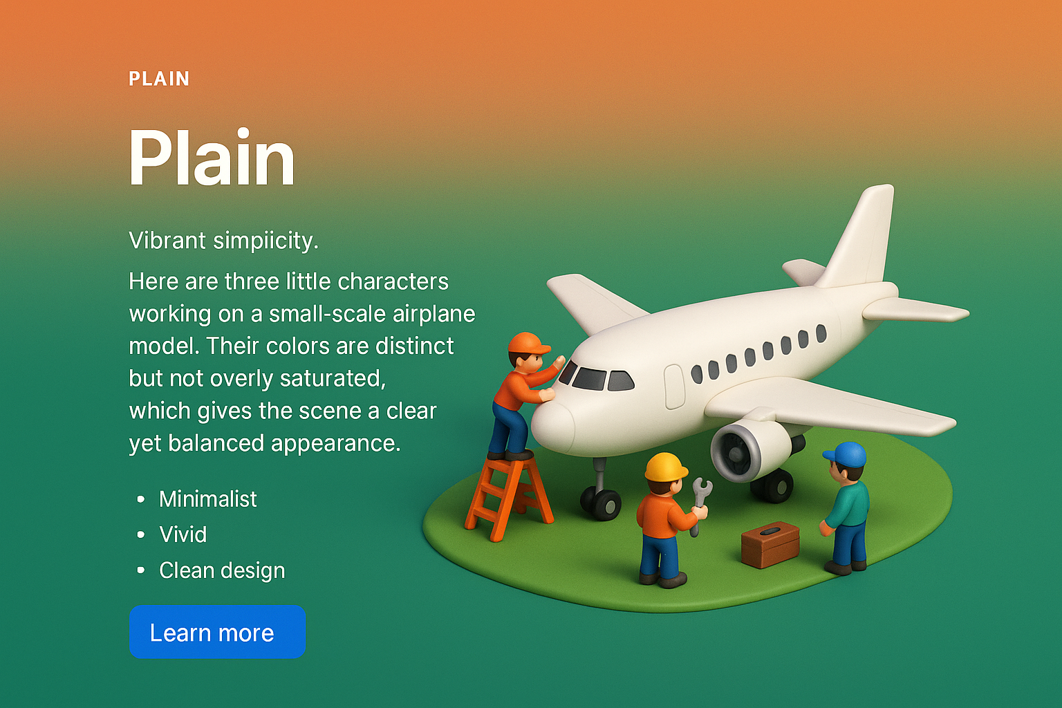 A vibrant and detailed 3D scene depicting tiny characters working on a small airplane model. The colorful environment creates a balanced and engaging visual.