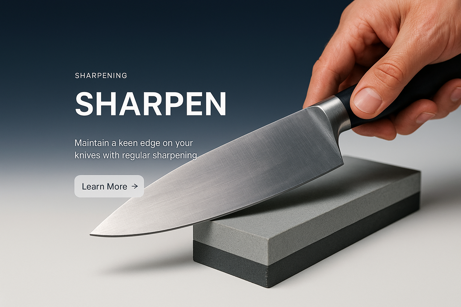 A modern web design concept showcasing a hand holding a knife, with a sharpening stone below. The design emphasizes clarity and effective text placement.