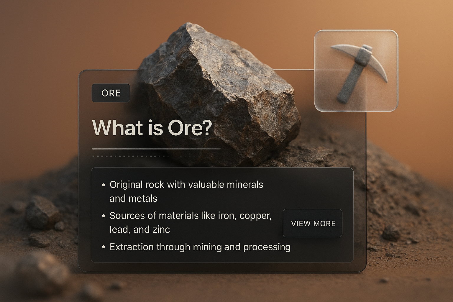 A 3D illustration featuring a rock with minerals, integrated with a transparent panel displaying information about ore. Includes a pickaxe icon and a gradient background.