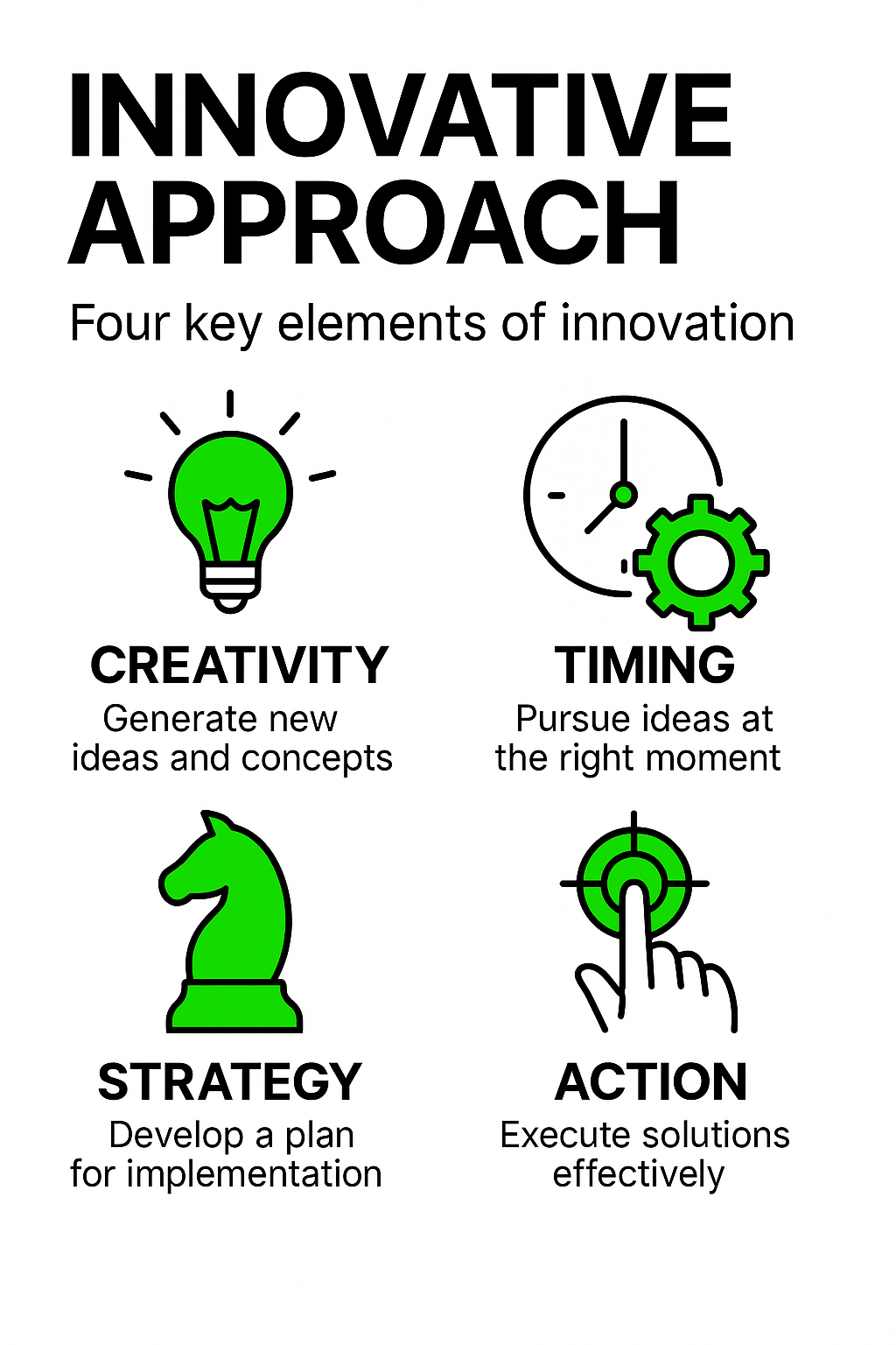 Informative infographic outlining four key elements of innovation with simple graphics and text, designed for educational and professional audiences.