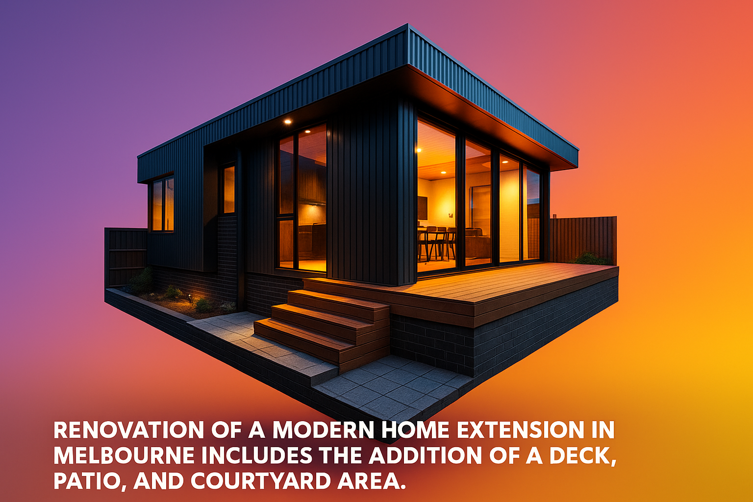 /Collection: /by davooda/Type: PNG/This image showcases a modern home extension in Melbourne, featuring a stylish deck, patio, and courtyard area. The dynamic lighting enhances the architectural details.