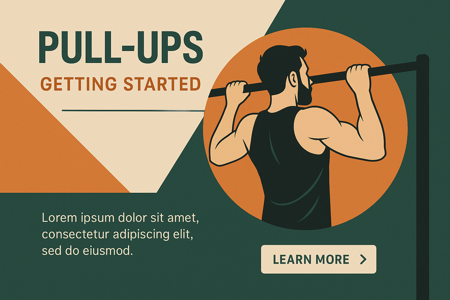 /Collection: /by davooda/Type: PNG/A visually appealing pull-up guide featuring a stylized figure performing the exercise. The design incorporates three color blocks, clear text hierarchy, and a call-to-action button.