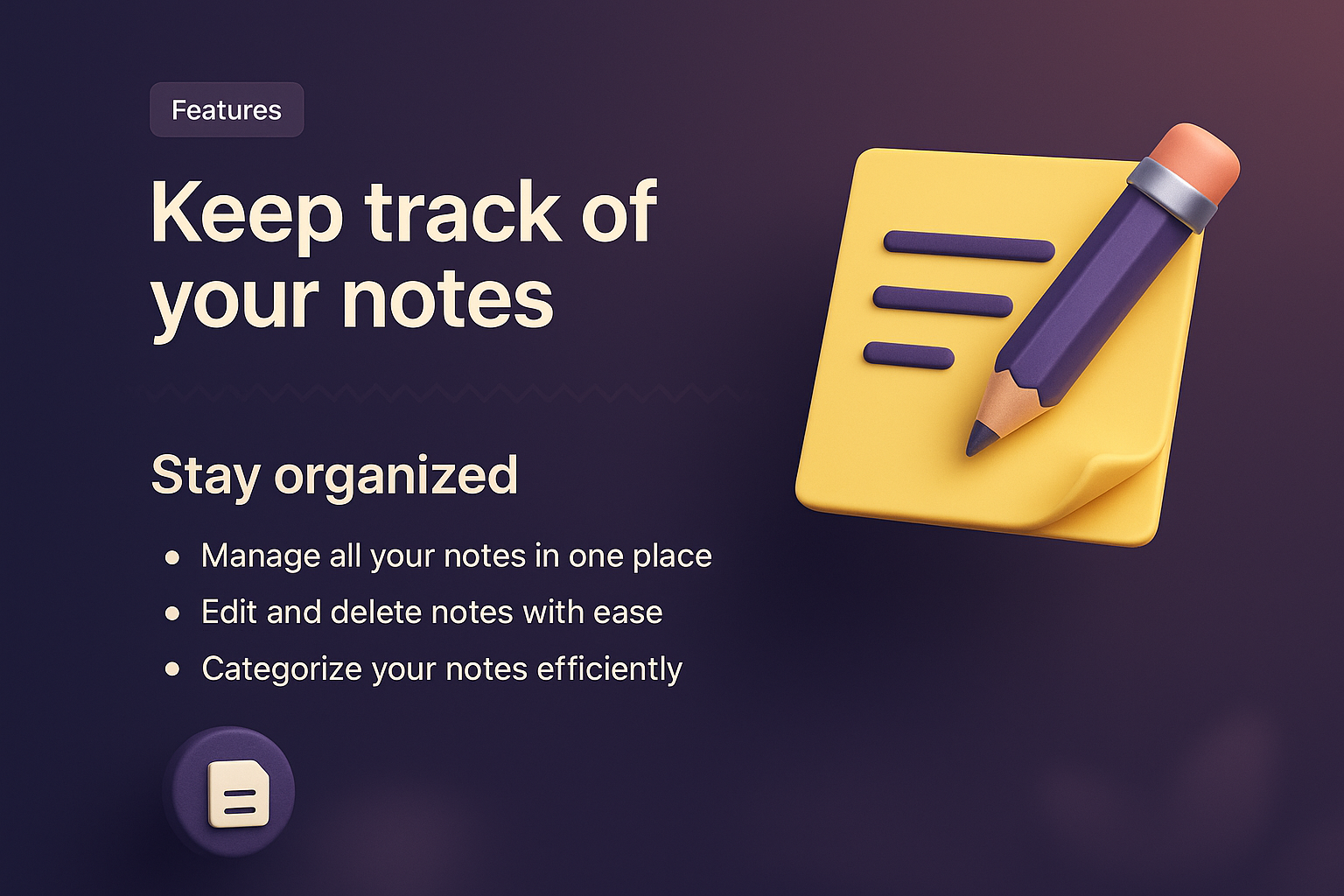 /Collection: /by davooda/Type: PNG/A visually appealing landing page featuring a 3D illustration of a note with a pencil. Highlights include organized features and a gradient background for depth.