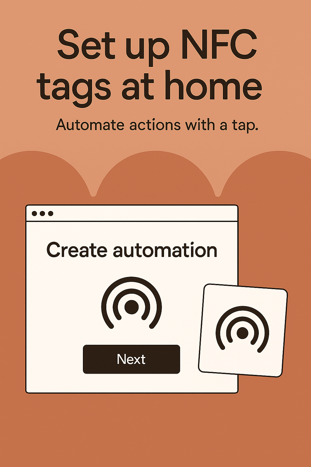 Simple instructional graphic illustrating how to set up NFC tags at home, featuring minimalistic design elements and a warm color palette, ideal for tech enthusiasts.