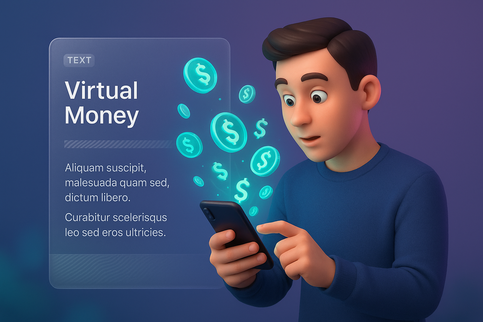 A person interacts with a smartphone as virtual currency icons float from the screen. A transparent block displays a title and text, enhancing the 3D effect.