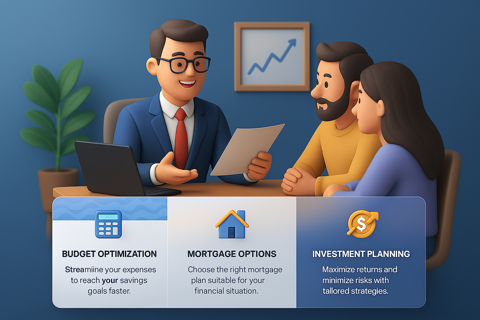 /Collection: /by davooda/Type: PNG/A 3D illustration of a financial advisor meeting with clients, discussing budgeting, mortgage options, and investment planning. The setting is a modern office with a gradient background.