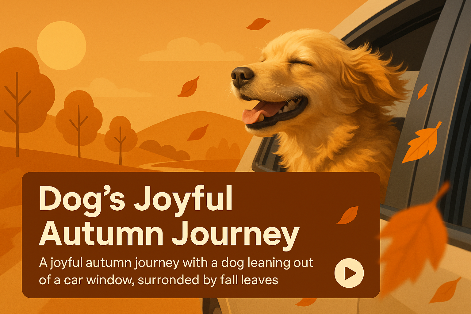 A vibrant illustration depicting a dog joyfully leaning out of a car window amidst falling leaves, ideal for pet-related content or seasonal promotions.