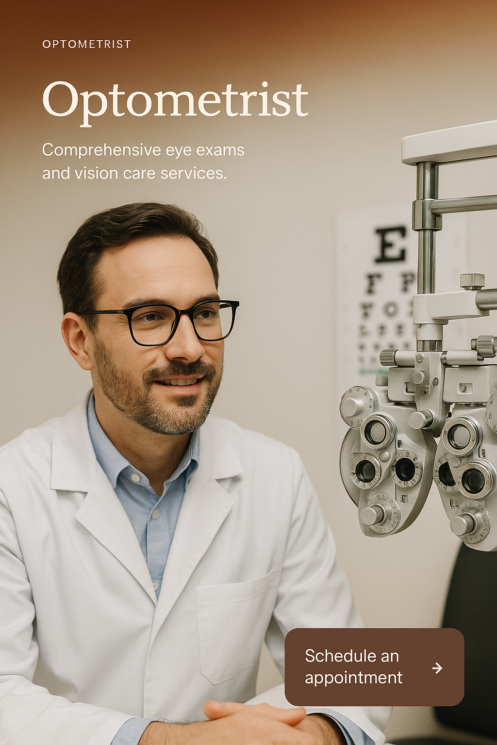 A professional optometrist in a white coat, showcasing eye exam equipment with a sleek design. Includes a clear action button for scheduling appointments.