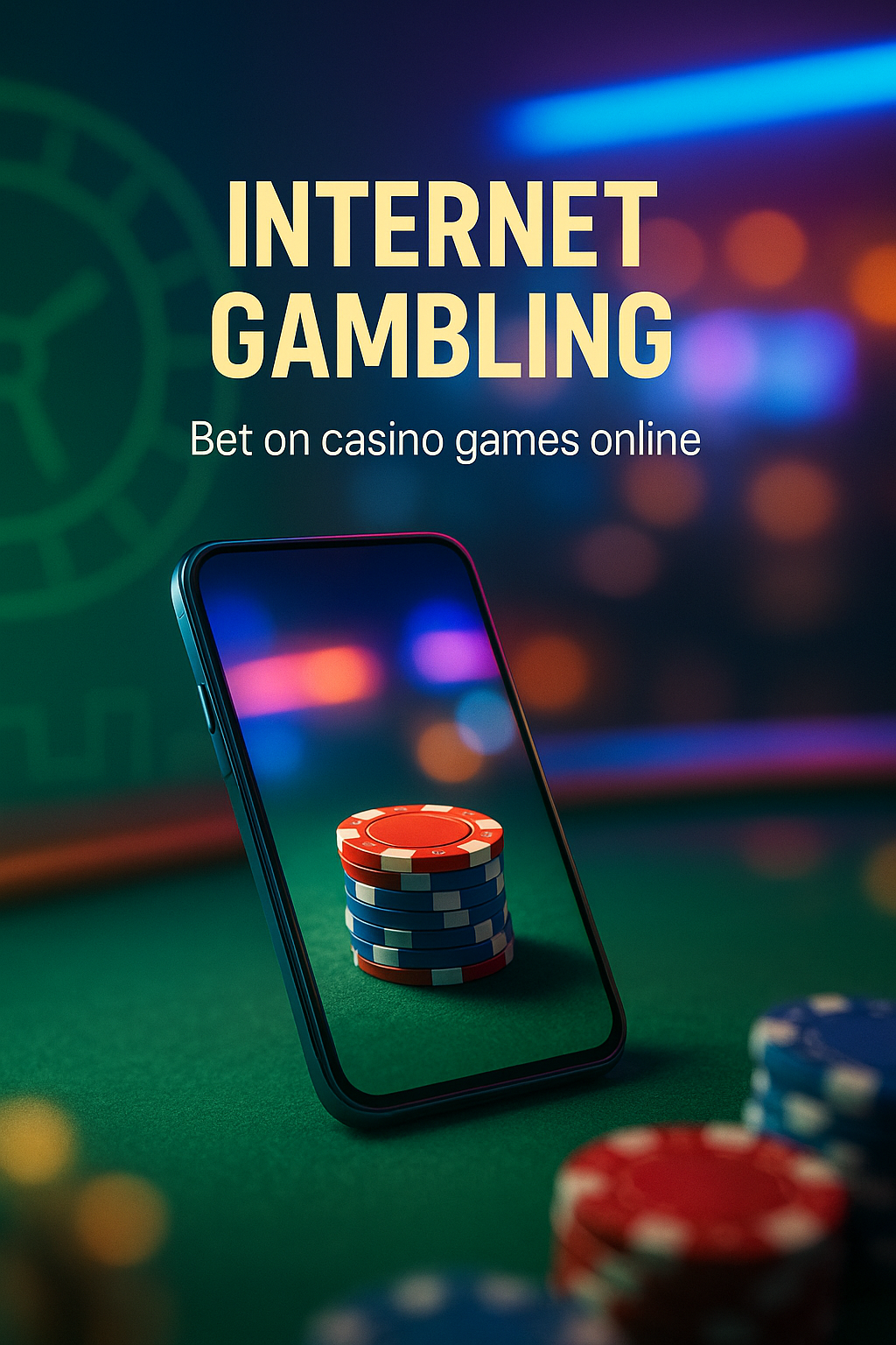 Vibrant promotional image showcasing online gambling with a smartphone displaying casino chips. Ideal for marketing online gaming platforms.