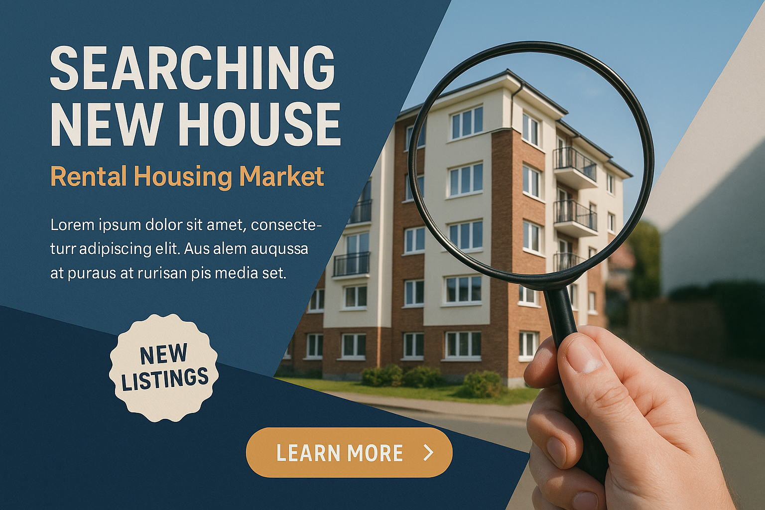 An image depicting a hand holding a magnifying glass, focusing on a residential building. The scene represents the search for new housing, emphasizing realism and professional design.