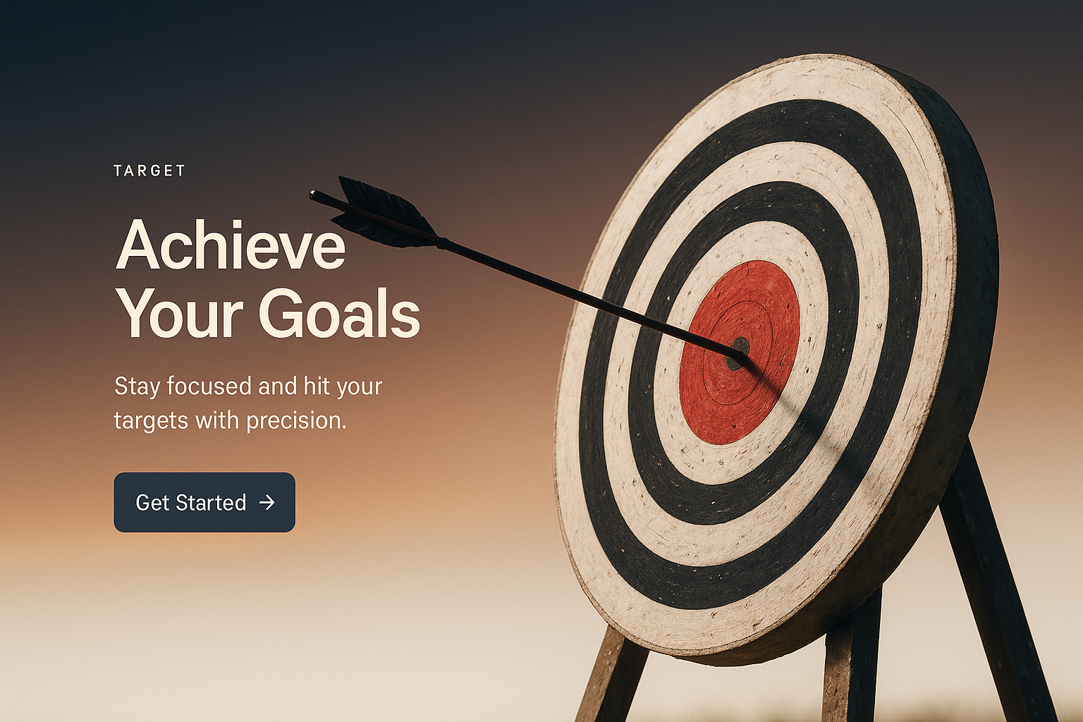 A stylish web page design showcasing a bullseye icon with an arrow hitting the target. The layout includes a small label, a concise title, a text block, and an action button.