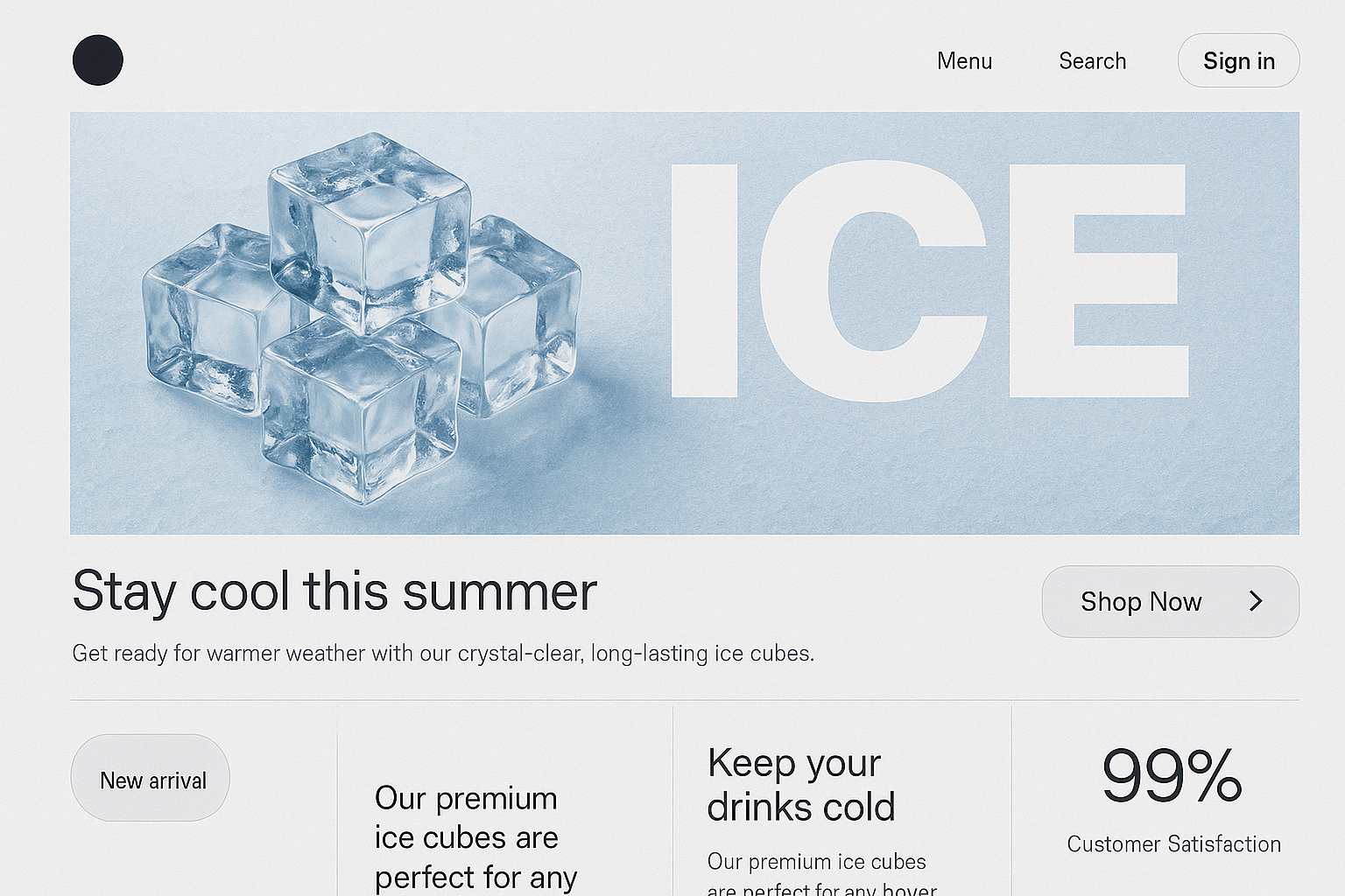 Modern Minimalistic Landing Page Design with Ice Cubes