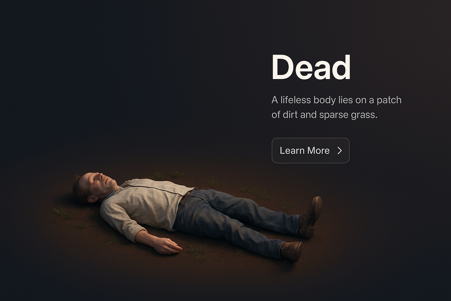 A detailed 3D scene showing a lifeless body on a patch of dirt and sparse grass. The background is dark, enhancing the visual impact of the scene.