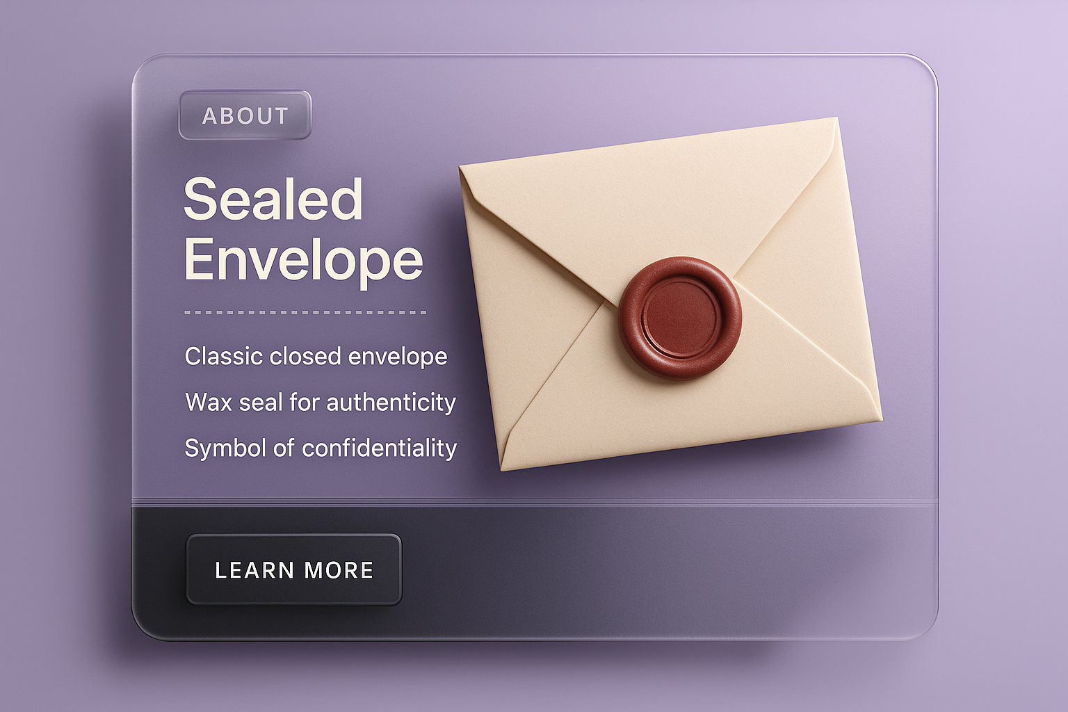 /Collection: /by davooda/Type: PNG/A 3D illustration of a sealed envelope featuring a wax seal on a gradient background. The design incorporates modern UI elements, including a translucent panel with text and a call-to-action button.