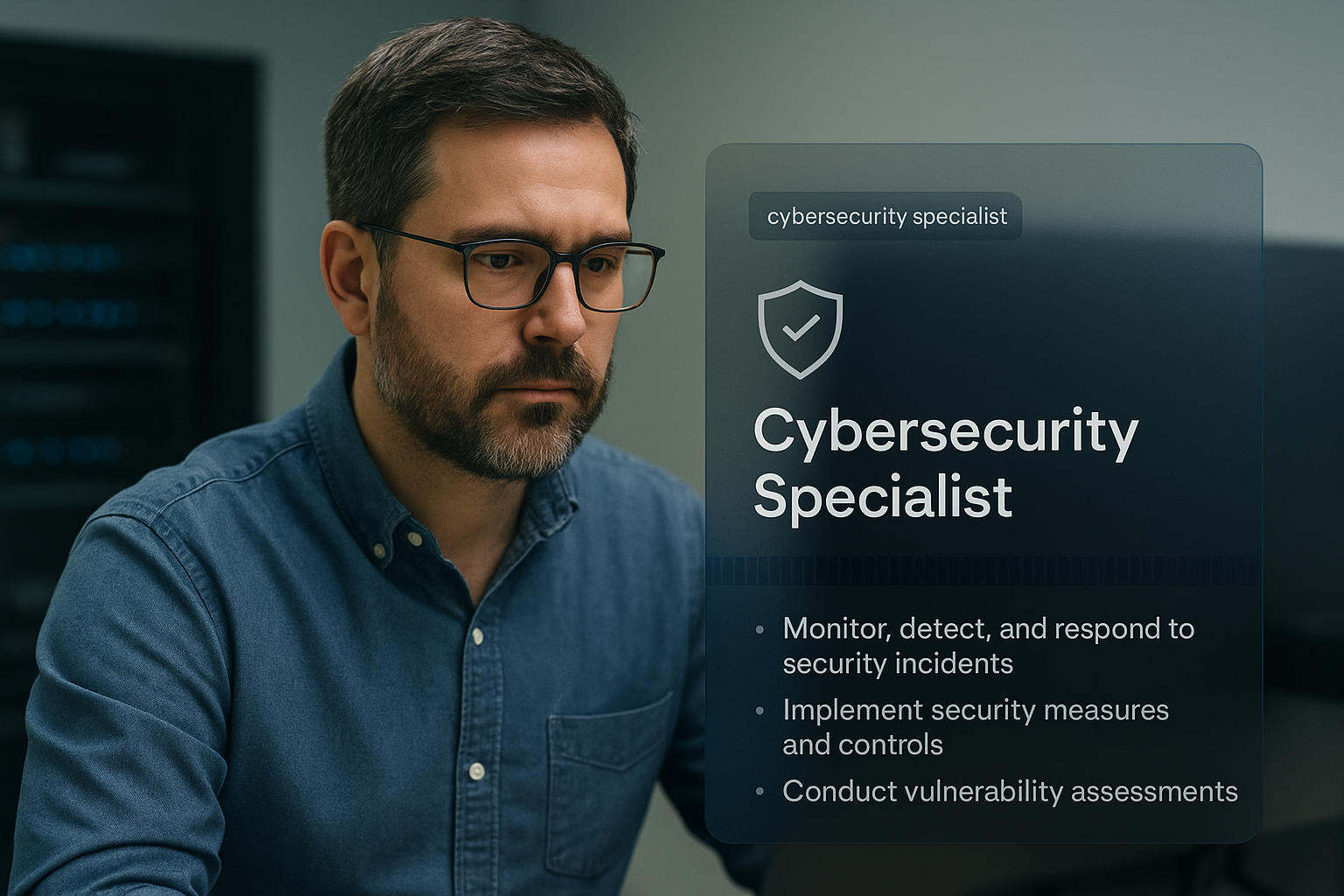 This image features a focused cybersecurity specialist working on a computer, accompanied by an integrated information panel highlighting key responsibilities.