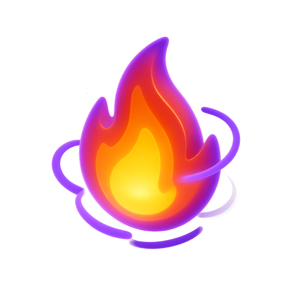 /Collection: /by davooda/Type: PNG/A visually striking 3D icon representing plasma, featuring a flame-like shape with vibrant orange, yellow, and purple hues. It has a transparent background and a three-quarter view, enhancing its volumetric appearance.