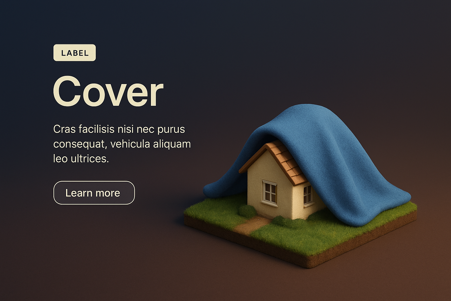 /Collection: /by davooda/Type: PNG/A zoomed-out 3D scene featuring a small house under a blue blanket, set against a dark gradient background. The design includes a label, title, text block, and action button, emphasizing clarity and realism.