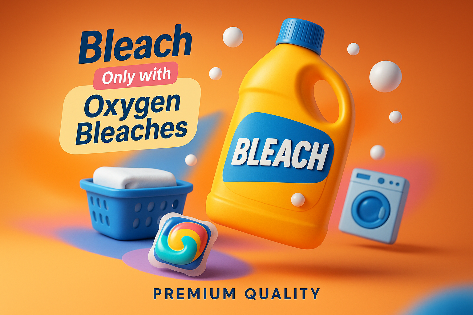 /Collection: /by davooda/Type: PNG/Vibrant promotional graphic showcasing a bleach bottle alongside laundry items. The design uses 3D elements and a colorful background, ideal for advertising cleaning products.