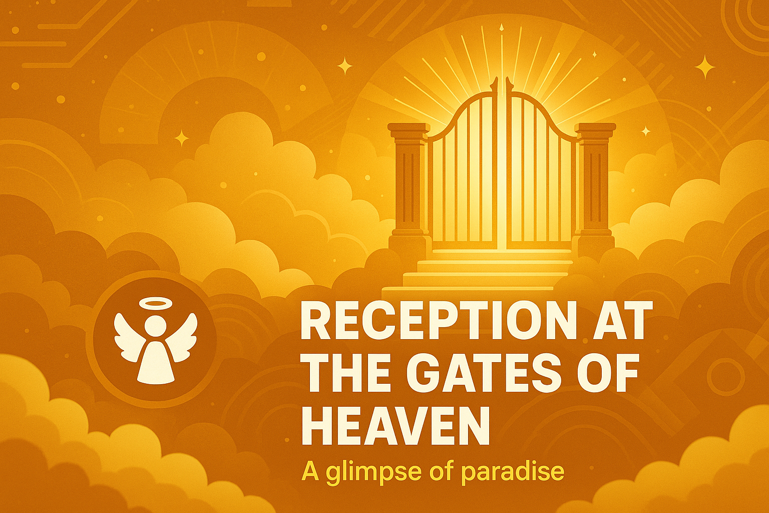 /Collection: /by davooda/Type: PNG/A vibrant illustration representing the reception at the gates of heaven, featuring angelic symbols and a warm color palette, ideal for spiritual or religious themed content.