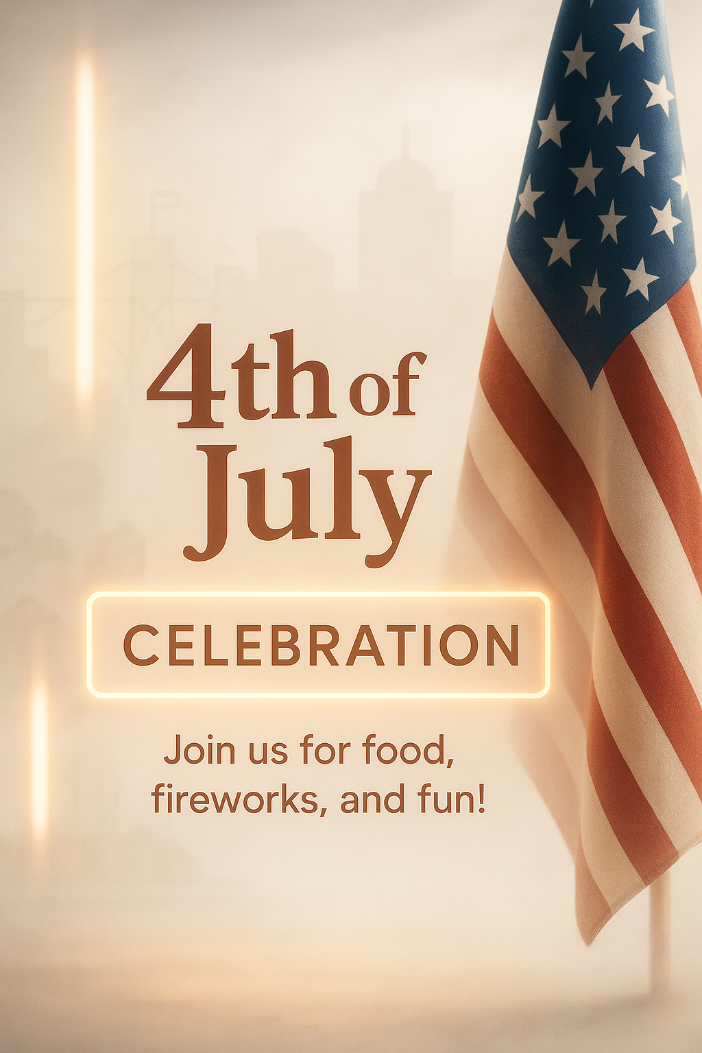 Festive promotional graphic for a Fourth of July celebration, featuring an American flag and warm color tones. Ideal for social media or event marketing.