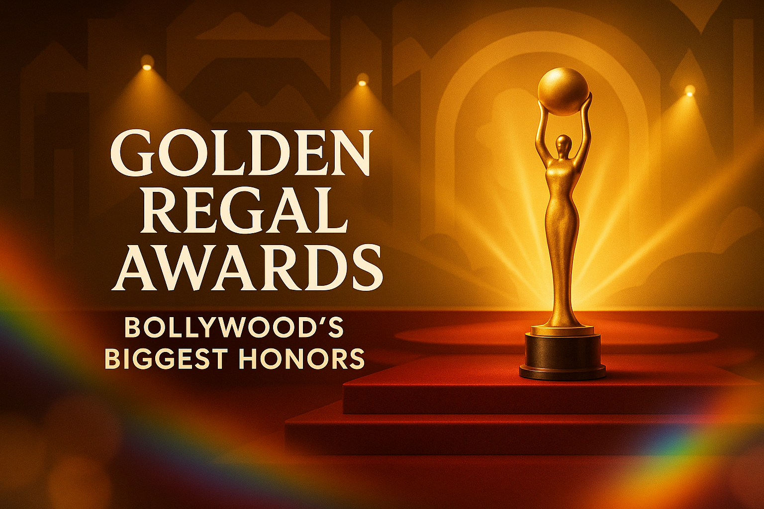 A visually striking promotional banner for the Golden Regal Awards, featuring a golden trophy on a pedestal with dramatic lighting, ideal for event marketing.