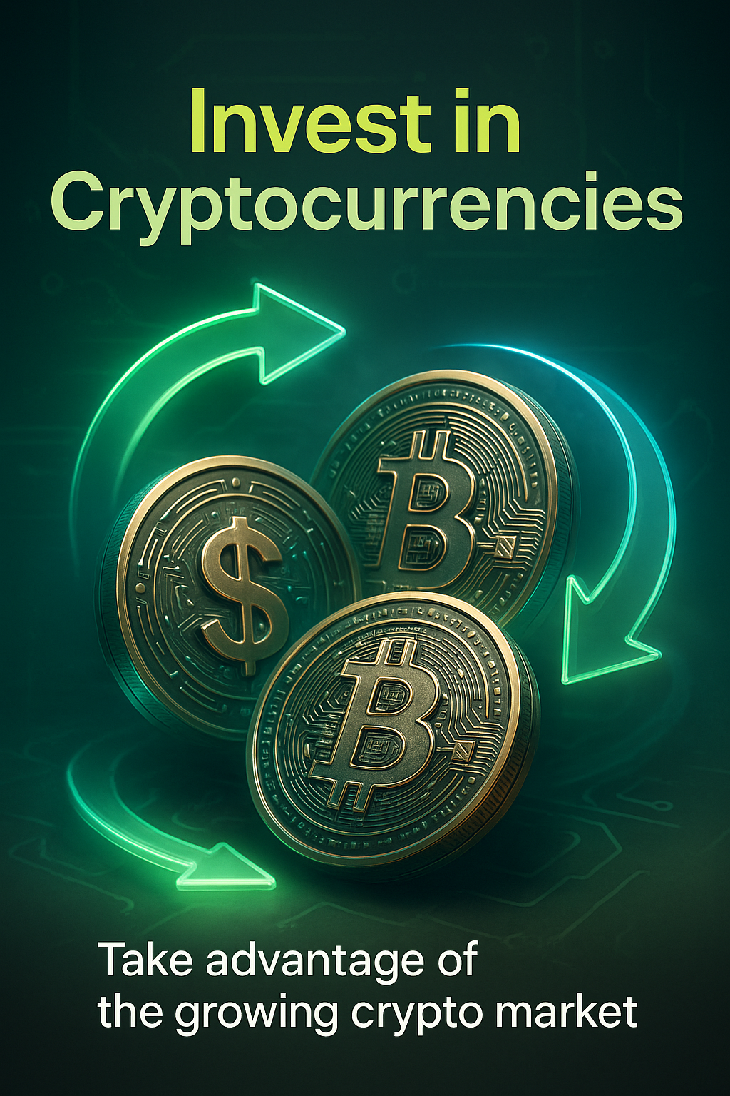 A visually striking promotional graphic featuring cryptocurrency coins and dynamic arrows, designed to attract investors to the growing crypto market.