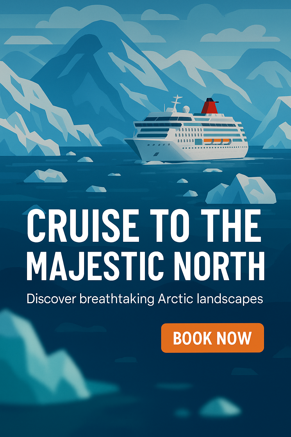 /Collection: /by davooda/Type: PNG/Vibrant promotional graphic depicting a cruise ship in an Arctic landscape, designed to entice travelers with stunning visuals and a clear call to action. Ideal for travel agencies and tourism marketing.
