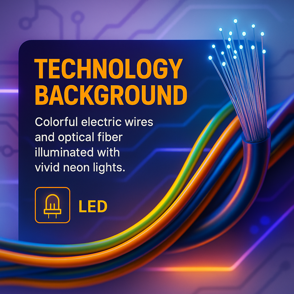 /Collection: /by davooda/Type: PNG/Vibrant technology-themed background featuring colorful electric wires and optical fibers illuminated by neon lights, ideal for tech-related designs.