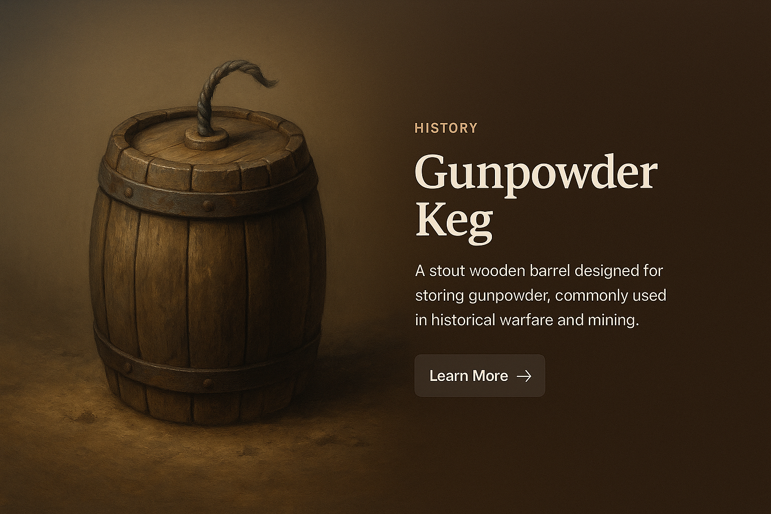/Collection: /by davooda/Type: PNG/A detailed illustration of a wooden gunpowder keg, set against a simple gradient background. The design features a clear title and description, enhancing historical context.