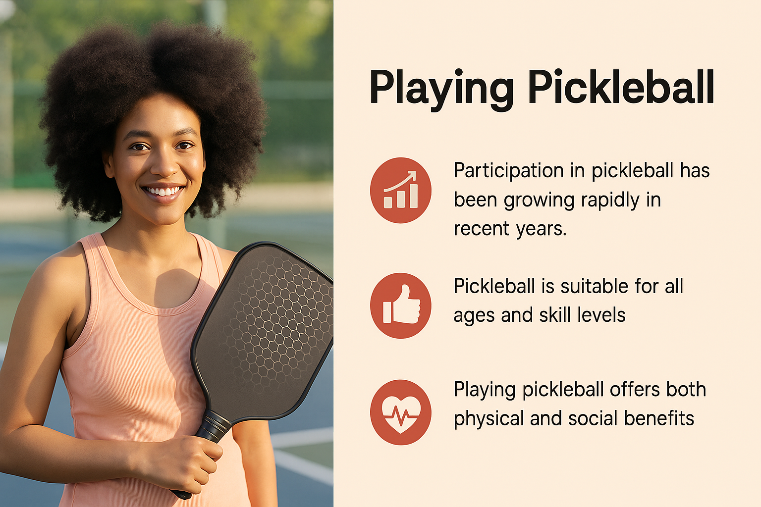 An engaging graphic promoting pickleball, featuring a smiling player and informative text boxes. Ideal for social media and community outreach.