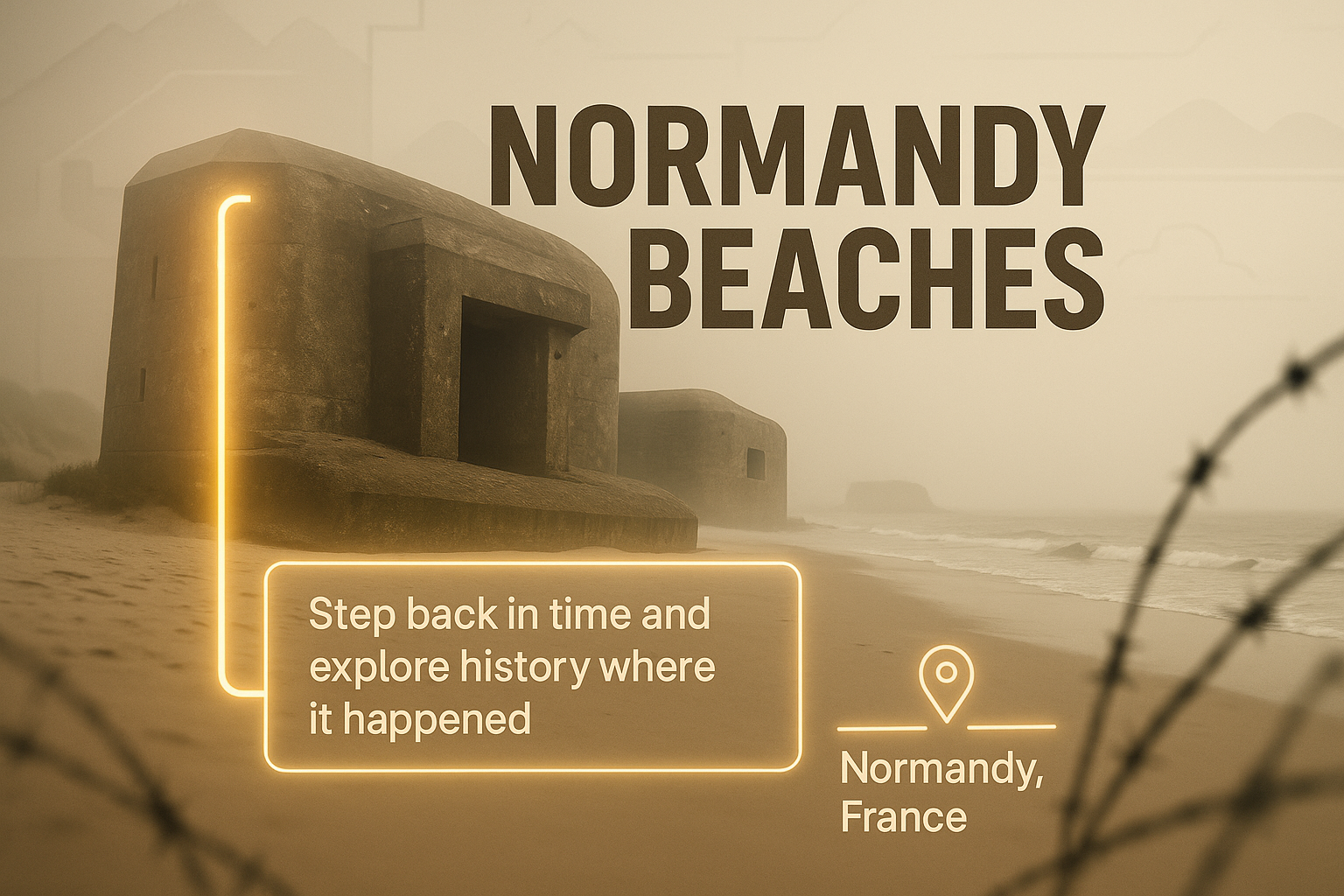 An evocative travel image highlighting the historical significance of Normandy beaches, featuring muted colors, a foggy atmosphere, and appealing design elements ideal for tourism marketing.