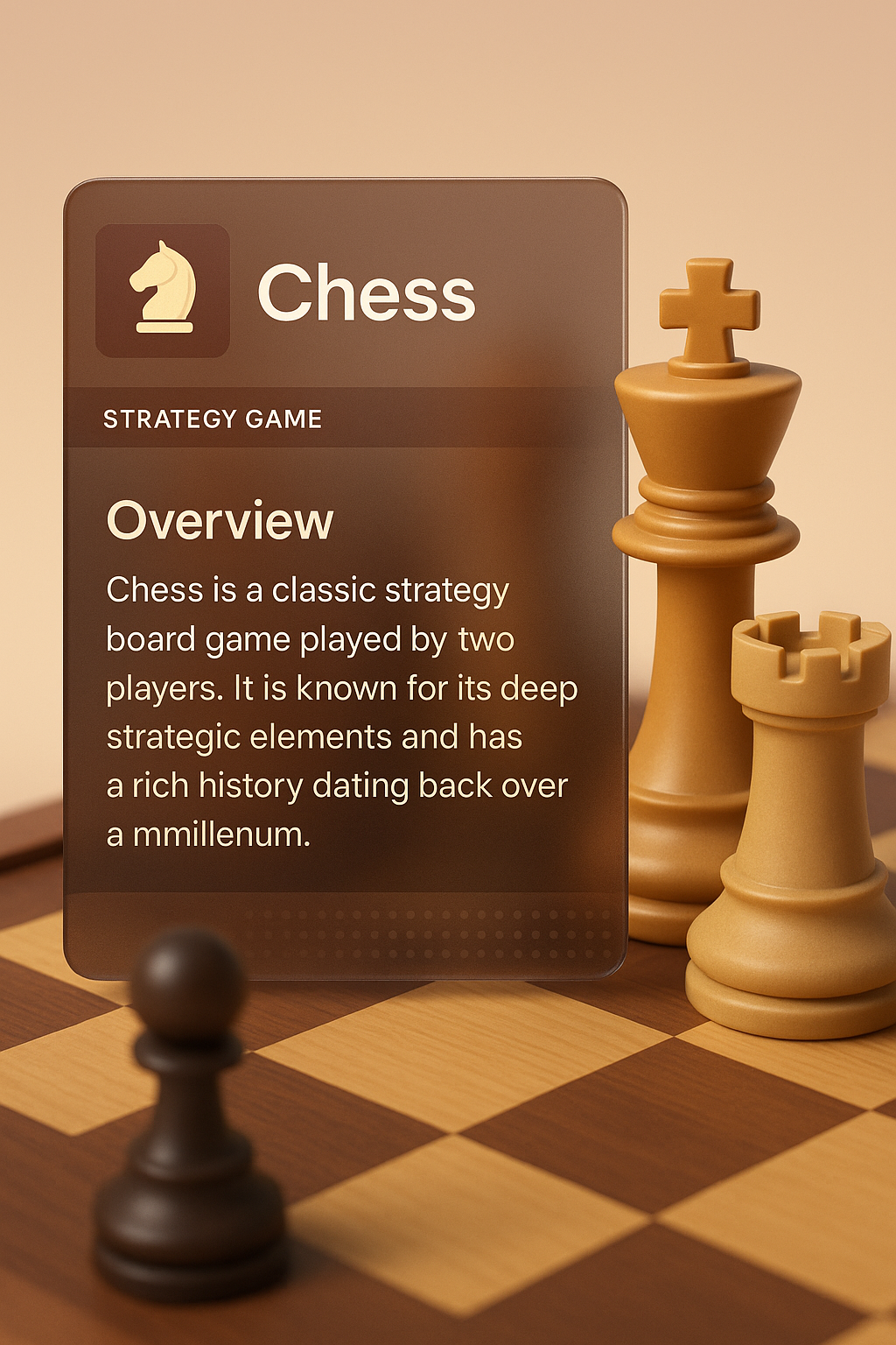 /Collection: /by davooda/Type: PNG/A visually appealing 3D illustration of a chess game setup, featuring a transparent overlay with a title and description. The design incorporates a smooth gradient background, enhancing readability.