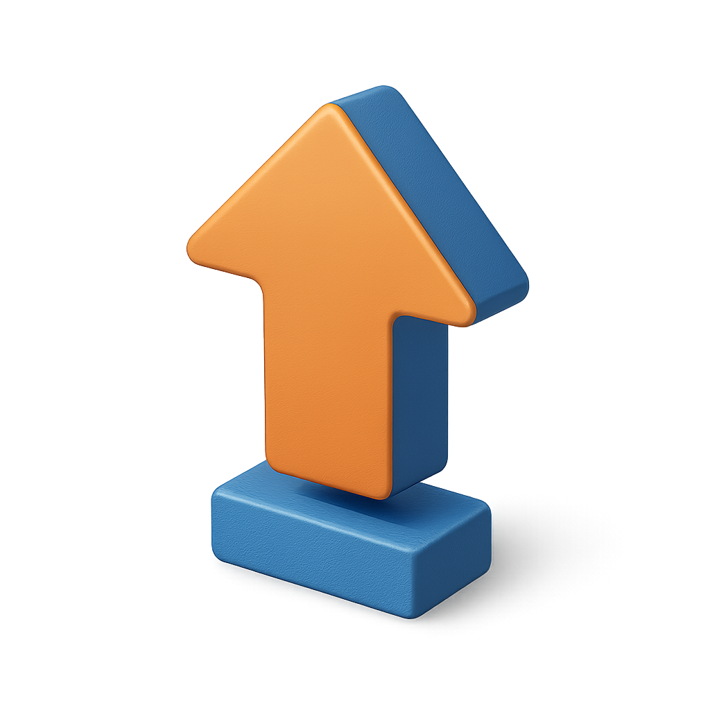 This image features a 3D upward-pointing arrow icon, designed in a three-quarter view. The arrow is orange and blue, with a smooth, volumetric appearance on a transparent background.